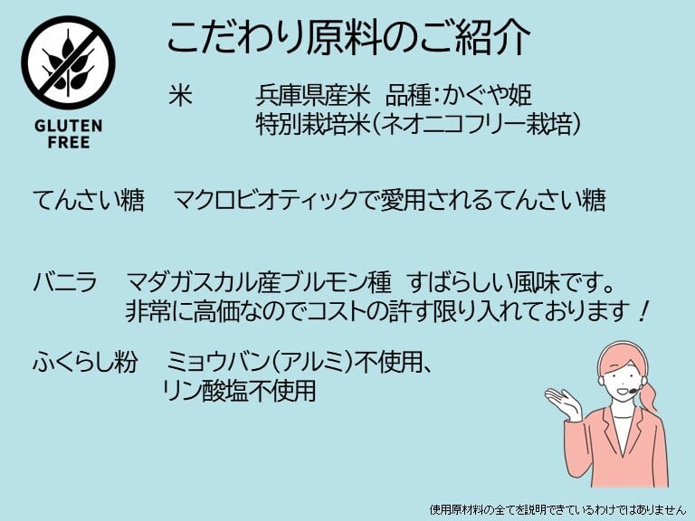 ☆ベーキングパウダーは、アルミ(ミョウバン)やリン酸塩を使わないマクロビオティック仕様です。